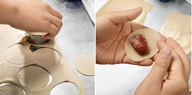 «Тесто надо раскатать тонким пластом, и с помощью какой-нибудь формы диаметром 6 см вырезать кружочки. Такой кружочек будет весить около 8 грамм, и столько же должна весить и начинка. Когда лепишь пельмени, надо следить за тем, чтобы внутри не оставалось пустот. И защипывать пельмени надо очень плотно, чтобы во время варки весь сок остался внутри и не ушел в бульон»