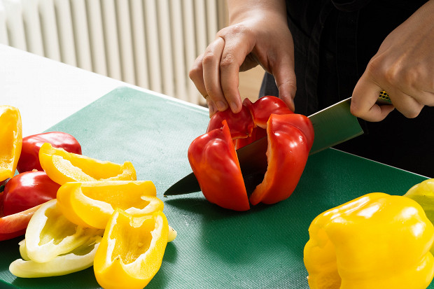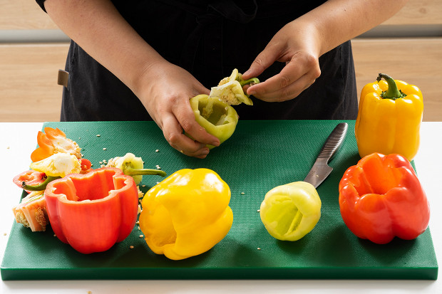 Вырежьте у перцев плодоножки по кругу и выньте за хвостик сердцевину вместе с семенами. Затем нарежьте перцы на четвертинки, удалите остатки семян и перегородки.