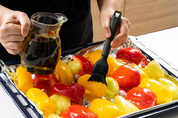 Смажьте кожицу каждого кусочка перца оливковым маслом.