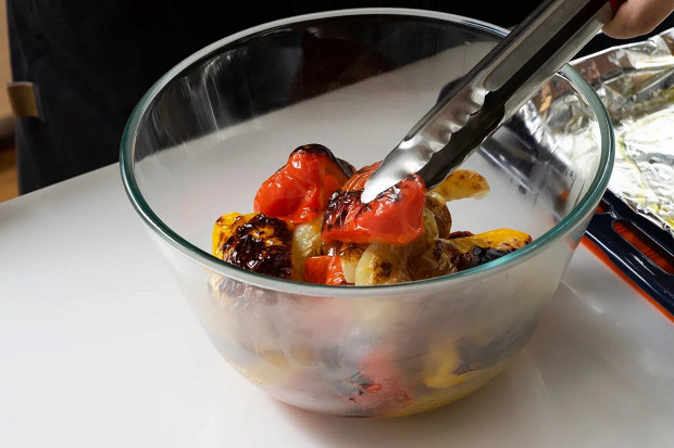 Разогрейте гриль в духовке до максимума (конвекцию и низ духовки включать не нужно), поставьте противень прямо под гриль минут на 20, пока на кожице не появятся темные подпалины.