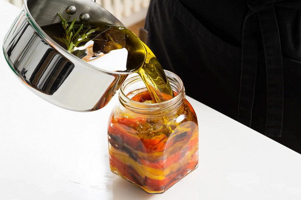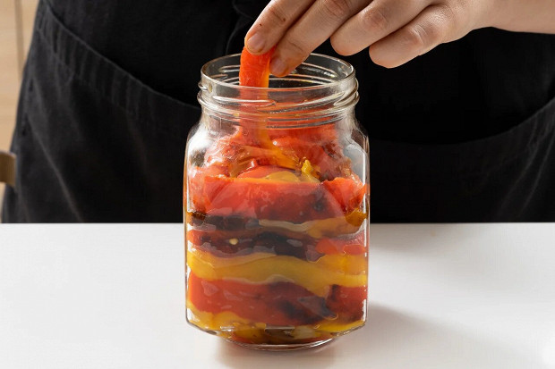 Запеченный сладкий перец выглядит в домашних заготовках гораздо интереснее свежего. У него появляются концентрированный вкус почти фруктовой сладости и легкий дымный аромат, который передает мякоти обожженная кожица. Если добавить в маринад мед, сладость усилится, а запеченный чеснок придаст для баланса еще и ноту остроты, все-таки консервы из перца — это не компот. Масло для заправки идеально брать оливковое, непременно первого, самого душистого отжима, тогда оно будет не просто фоном, а еще одной вкусовой составляющей.