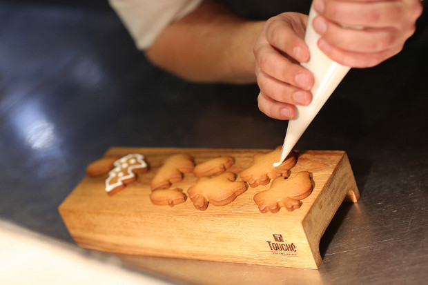 Украсьте печенье при помощи глазури. Для глазури возьмите 150 грамм сахарной пудры, 1 белок, по половине чайной ложки лимонного сока и водки, смешайте все до однородности, переложите в кондитерский мешок.