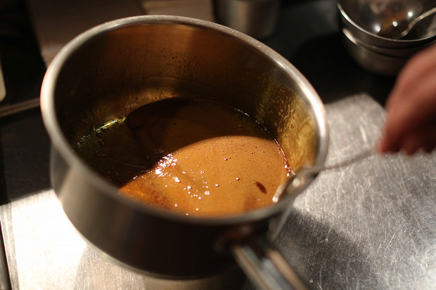 Сначала нужно сделать основу для теста. Возьмите 150 грамм сахара и растопите его до состояния карамели в сотейнике. Топите на медленном огне, периодически помешивая. Когда сахар растопится и станет коричневым, постепенно влейте 75 мл воды и 25 грамм квасного сусла. Оно дает печенью специфический пряный аромат. Еще наличие в рецепте квасного сусла можно объяснить тем, что культура кваса в Прибалтике очень сильна.