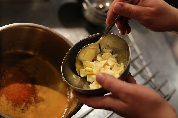 Когда все станет однородной массой, добавьте в основу для теста 50 грамм сливочного масла.