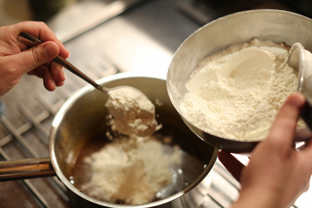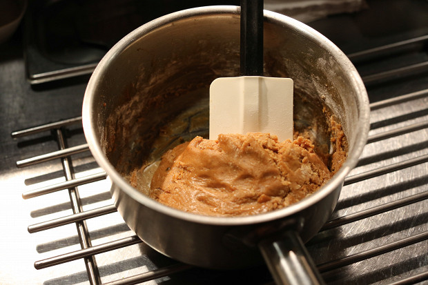 Снимите массу с огня, дайте ей 30 минут, чтобы остыть. Затем добавьте в основу 225 грамм просеянной пшеничной муки высшего сорта. Перемешивайте, пока масса не станет однородной. Тесто должно получиться довольно липким.