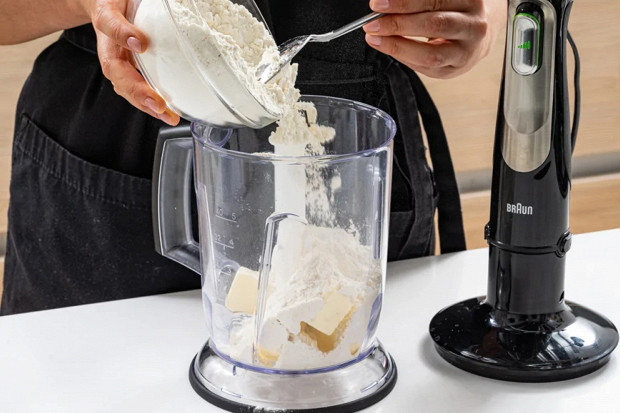 Теперь займитесь тестом. Положите холодное масло (150 г), соль и муку (300 г) в комбайн и порубите так, чтобы кусочки масла были размером с горошек.