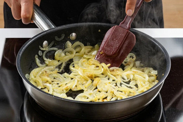 Разогрейте на сковороде растительное масло, выложите лук и обжарьте до золотистого цвета.