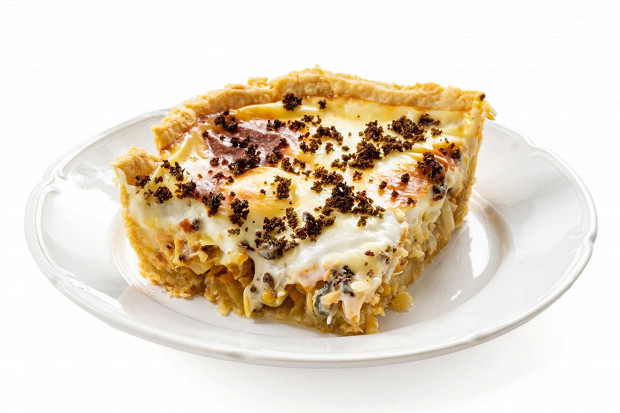 Соседство в одном пироге рыбы и капусты только на первый взгляд кажется спорным. Но оно отлично работает: если вы используете суховатую горбушу из банки или, например, филе минтая, капуста добавит рыбе нежности, а начинке в целом объема. А если в начинке более жирная рыба — палтус или семга, тогда роль капусты заключается в том, чтобы эту лишнюю жирность сбалансировать и начинку взбодрить. Тесто в этом пироге получается хрустящим, слоеным и хорошо держит начинку. Когда мы готовили пирог на кухне «Еды», то отметили, что это определенно один из лучших вариантов теста для открытых пирогов в принципе, и теперь часто используем его для пирогов и с другой сладкой и несладкой начинкой.