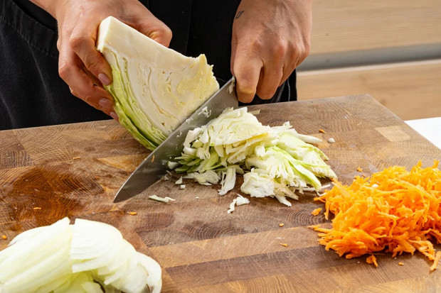 Поставьте духовку разогреваться до 180 градусов, а пока начните готовить начинку. Капусту нашинкуйте, морковь натрите на крупной терке, лук нарежьте кольцами.