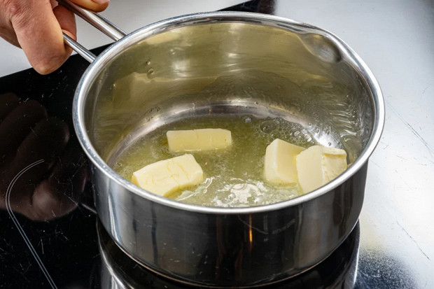 Пока капуста тушится, есть время приготовить соус бешамель. Масло (50 г) на небольшом огне растопите и прогрейте, пока оно не перестанет шипеть.
