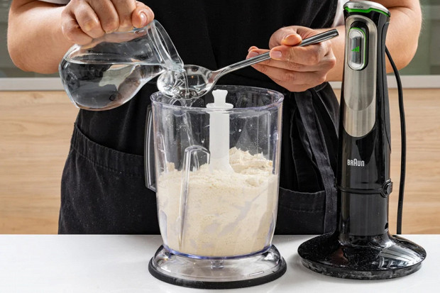 Влейте в чашу блендера 8 столовых ложек ледяной воды и вымесите тесто до однородности.