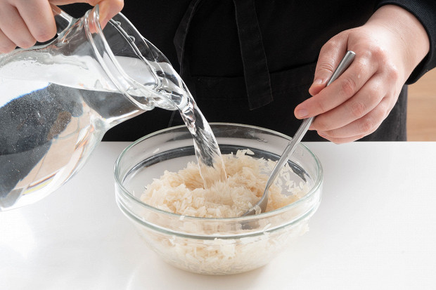 Сначала нужно подготовить рис. Мы используем басмати — он легко и быстро варится, но можно любой другой, но тогда время приготовления, возможно, придется скорректировать. Басмати не требует замачивания, но его необходимо хорошенько промыть. Делать это надо так: отмерьте 300 грамм риса, засыпьте в холодную воду и хорошенько покрутите воду ложкой, вода быстро станет мутной. Тогда воду слейте, налейте свежую и продолжайте таким образом промывать рис, пока вода не станет чистой. Тогда откиньте рис на сито и дайте постоять, чтобы вся вода ушла.