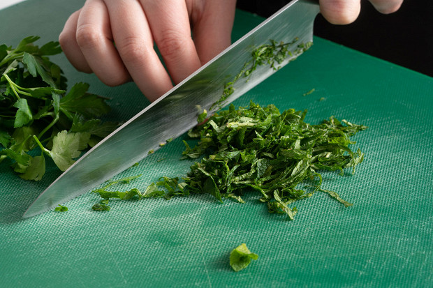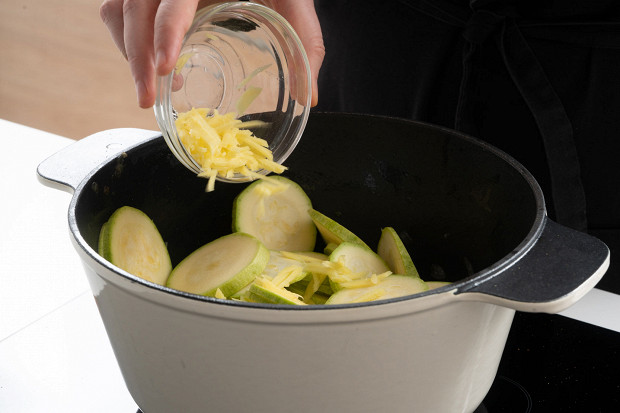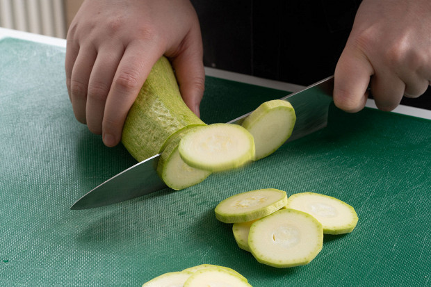 Пару цукини или молодых кабачков нарежьте тонкими кружочками, кожу, если она нежная, можно оставить. Про внутренности решайте сами: если кабачок старый, а внутренности поролоновые, то их лучше изъять. С некрупными цукини эту операцию проводить необязательно.
