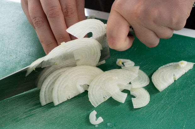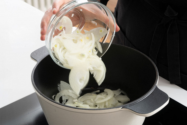 В большой, тяжелой кастрюле разогрейте 3 столовые ложки растительного масла. Выложите лук, посолите и готовьте 20 минут, регулярно помешивая, не давая пригорать. Можно взять растительное масло пополам со сливочным, если постность блюда для вас не так важна. Треть готового лука отложите в отдельную миску.