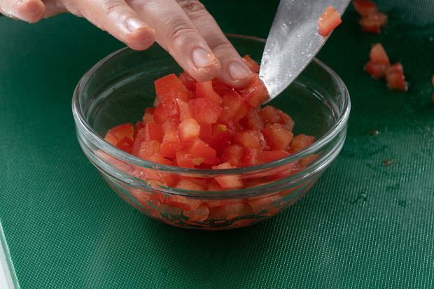 Еще нам понадобятся два-три среднего размера помидора. Разрежьте их пополам, ложкой выньте сердцевину с семенами, а мякоть нарежьте небольшими кубиками. Хотя сердцевинки можно оставить, но тогда томатные семечки будут путаться на языке.