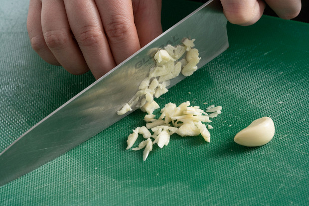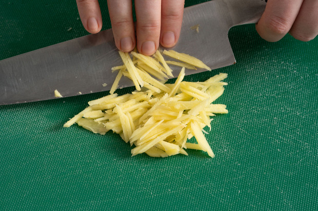 Кусочек имбиря размером в 3 см очистите и нарежьте тонкой соломкой.