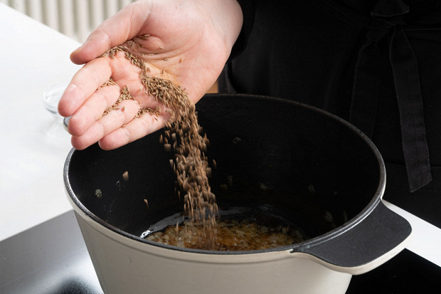 К тому луку, что остался в кастрюле, добавьте зиру, потерев ее между ладонями. Готовьте еще буквально минуту, пока зира не раскроет аромат.