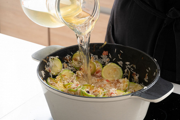 Влейте овощной бульон, примерно 900 мл или чуть больше — нужно, чтобы он покрывал содержимое кастрюли на 1–2 см. Добавьте соль и перец, дайте ему закипеть и убавьте огонь до тихого. Тут, если бульон не сварен заранее, вполне подойдет бульон из кубиков, но тогда плов не нужно солить.