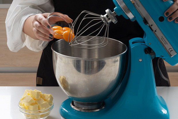 Возьмите 4 куриных яйца, отделите белки от желтков. Желтки положите в чашу миксера, добавьте 200 грамм размягченного сливочного масла и разотрите все добела при помощи насадки венчик. Белки уберите в холодильник.