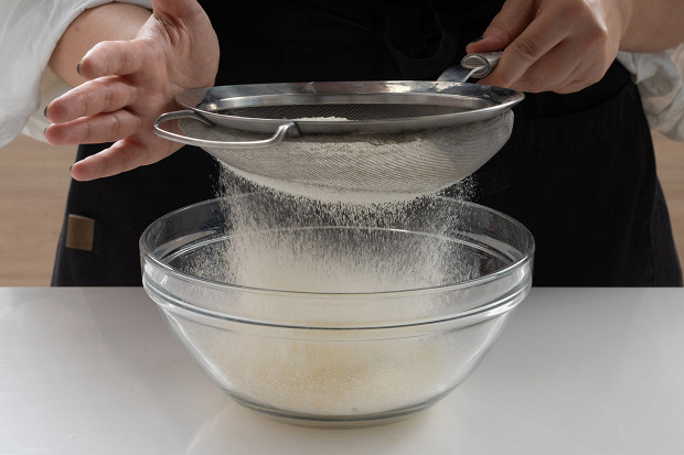 Просейте через сито 200 грамм пшеничной муки и 1 ч.л. разрыхлителя.