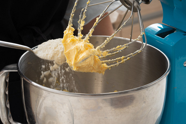 Добавьте муку и разрыхлитель к маслу и желткам, смешайте все и вымесите крутое тесто, оно должно отставать от рук.