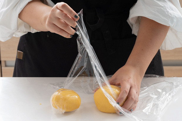 Разделите тесто на части, составляющие 1/3 и 2/3 от объема. Из каждой сформируйте шар, заверните его в пленку. Маленький шар положите в морозилку на 1 час, большой — в холодильник, тоже на 1 час.