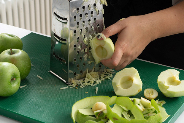 Пока тесто отдыхает в холодильнике, подготовьте яблоки. Для этого 1 кг зеленых яблок (или антоновки) очистите от кожуры и семян и натрите на средней терке.