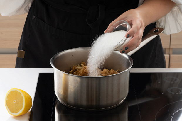 Переложите тертые яблоки в сотейник. Добавьте 15 мл лимонного сока и 100 грамм сахара, перемешайте, включите средний огонь и томите в течение 15 минут или около того. Ориентируйтесь на жидкость — она должна полностью выпариться.