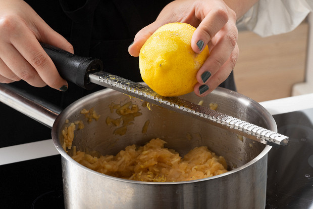Затем добавьте цедру одного лимона, перемешайте и охладите все до комнатной температуры.
