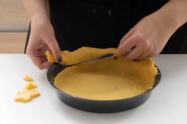 Достаньте тесто из холодильника, раскатайте его в пласт толщиной 5–7 мм. На дно круглой формы для выпекания положите пергамент. Затем уложите на пергамент тесто. Обрежьте края теста, оставив бортик высокой около 1 см.