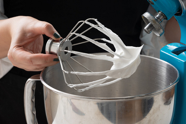 Достаньте белки из холодильника, положите их в чашу миксера, начните взбивать на небольшой скорости насадкой венчик. Когда белки взобьются до состояния твердой пены, начните тонкой струйкой всыпать сахар (всего 180 г), продолжая взбивать массу. Когда сахар растворится, а пена станет глянцевой и очень плотной, готово.