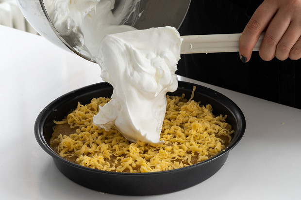 На тертое тесто аккуратно лопаткой выложите взбитые с сахаром белки, следите за тем, чтобы пена не опала.