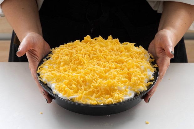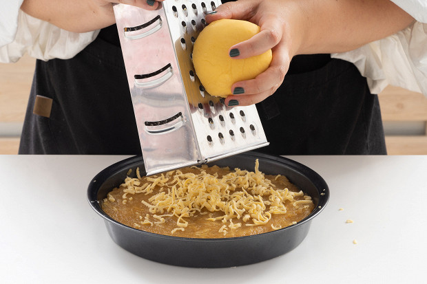 Достаньте тесто из морозилки. Натрите половину на терке и распределите по поверхности пирога.