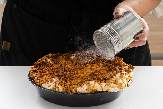 Натрите вторую половину теста и распределите по поверхности белковой пены. Поставьте пирог в духовку, разогретую до 190 градусов, на 45 минут.