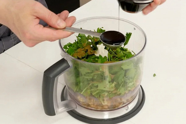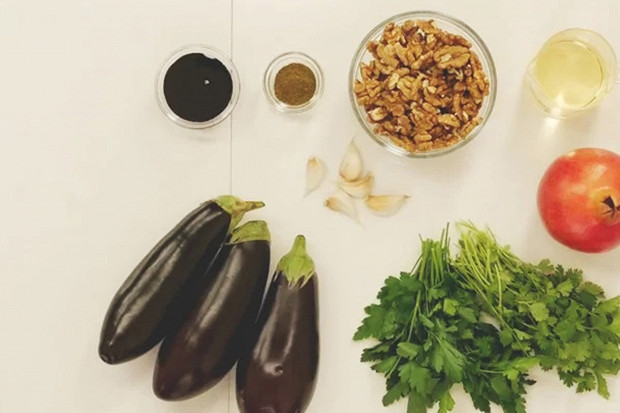 Подготовьте начинку для рулетов из баклажанов. В блендере пробейте грецкие орехи, мелконарезанную зелень, хмели-сунели, соль, чеснок, 30 мл горячей воды и гранатовый соус наршараб. Если масса получается слишком густой, добавьте немного горячей воды.