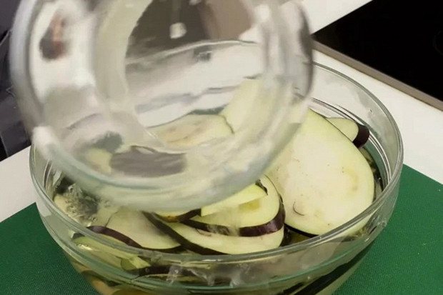 Замочите слайсы баклажанов на 15–20 минут в емкости с соленой теплой водой.