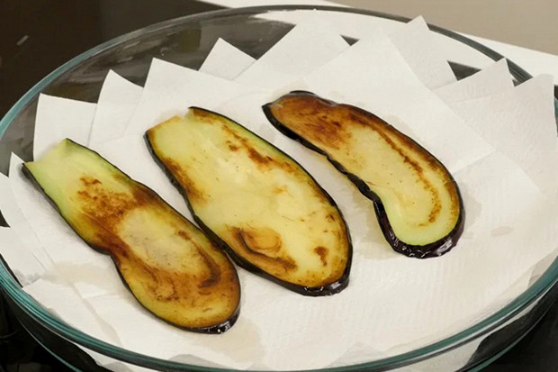 Готовые баклажаны выложите на бумажные полотенца, чтобы они впитали лишнее масло.