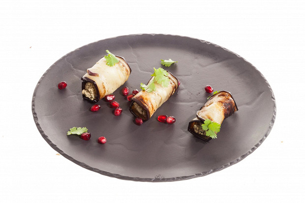 Готовые рулеты из баклажанов выложите на тарелку и посыпьте зернами граната.