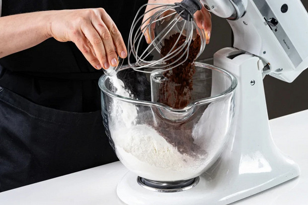 В деже миксера смешайте муку, разрыхлитель и какао-порошок. Какао-порошок бывает разным — все зависит от производителя. Если есть такая возможность, выберите тот вкус, что вам нравится больше всего. И какао это должно быть без сахара, чтобы пропорции рецепта не изменились.