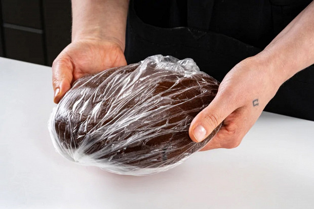 Сформируйте из теста шар, оберните его пищевой пленкой и уберите в холодильник на 30 минут. Это позволит клейковине расслабиться, и тесто станет эластичным.