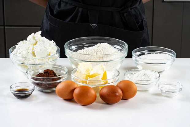 Подготовьте все ингредиенты: 300 г пшеничной муки, три чайных ложки разрыхлителя, 40 г какао-порошка, 300 г сахара, три чайных ложки ванильного экстракта, четыре куриных яйца, 350 г сливочного масла, полкило творога и 40 г кукурузного крахмала.