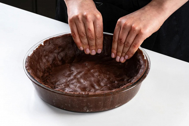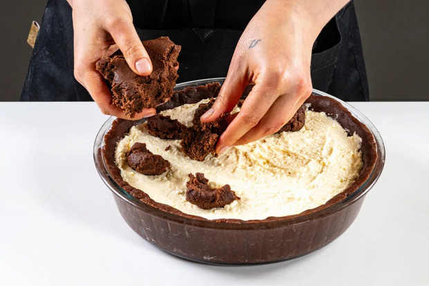 Переложите творожную начинку на шоколадное тесто в форме и равномерно распределите его по всему диаметру. Оставшееся шоколадное тесто порвите на небольшие кусочки и выложите сверху на творог.