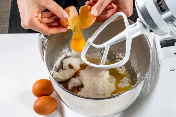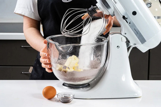 Добавьте в дежу половину заявленного в рецепте сахара, чайную ложку ванильного экстракта, 1 яйцо и 200 г размягченного сливочного масла — хорошо бы, чтобы это масло было жирностью 82,5%. Вымесите сначала на низкой, а затем на высокой скорости до гладкого теста.