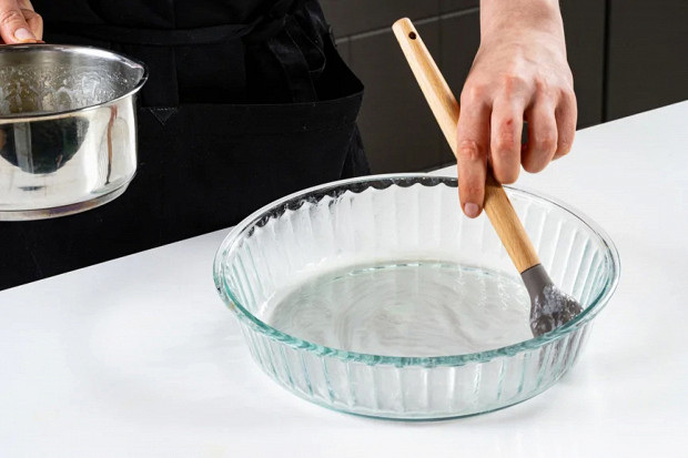 В это время разогрейте духовку до 180 градусов и тщательно смажьте частью растопленного масла форму для пирога (диаметром 26 см).