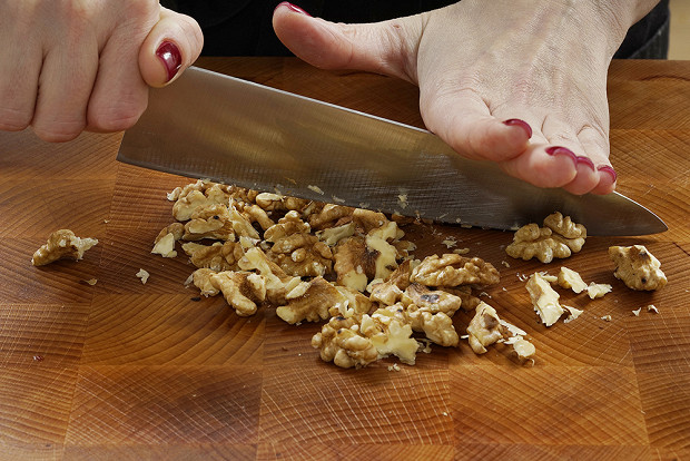 Остудите орехи и крупно порубите ножом.