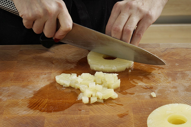 Из банки с консервированным ананасом слейте жидкость, нарежьте ананасы кубиками такого же размера.