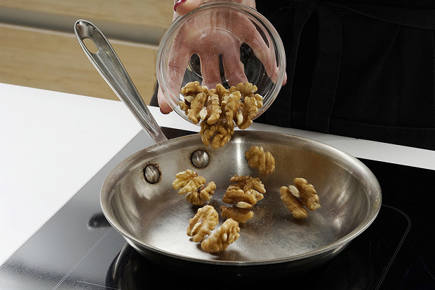 Быстро обжарьте грецкие орехи на сухой сковороде, чтобы они дали аромат.
