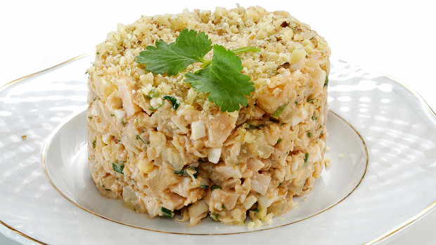 Один из самых быстрых и простых праздничных салатов с довольно прозаичным набором ингредиентов, собственно, за «праздник» в нем отвечают консервированные ананасы. Бывшие когда-то редкостью и деликатесом, они и придают отварной курице, яйцам, сыру и орехам cоответствующее настроение. Нам оно досталось по наследству — сейчас, в эпоху глобализации, никого не удивишь даже свежими ананасами, не говоря уже о консервированных.