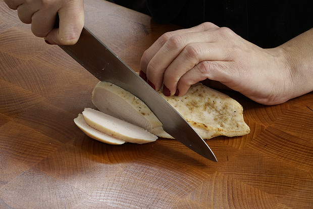 Куриную грудку (или филе) нарежьте такими же кубиками, как и яйца.