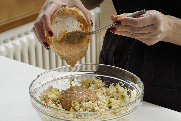 Смешайте майонез и кетчуп, добавьте зелень и все перемешайте.
